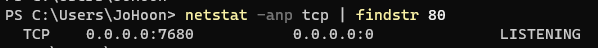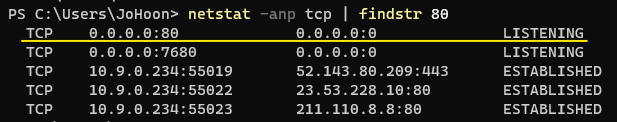 cmd를 열어 아래 명령어로 현재 사용 중인 포트를 조회할 수 있습니다.