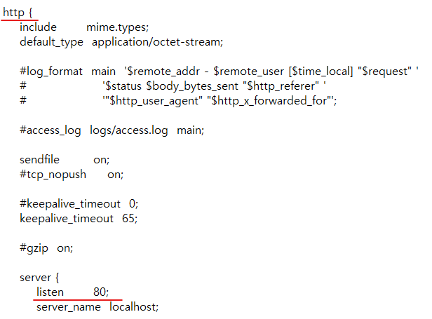 nginx.conf 파일을 열어보면 http프로토콜로 80포트를 열겠다고 명시되어 있습니다.