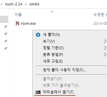 자신의 운영체제에 맞는 nssm 폴더에서 마우스 오른쪽클릭 -> 터미널을 열어줍니다.
