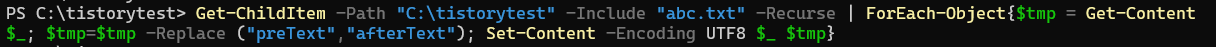 Get-ChildItem -Path "C:\tistorytest" -Include "abc.txt" -Recurse | ForEach-Object{$tmp = Get-Content $_; $tmp=$tmp -Replace ("preText","afterText"); Set-Content -Encoding UTF8 $_ $tmp}