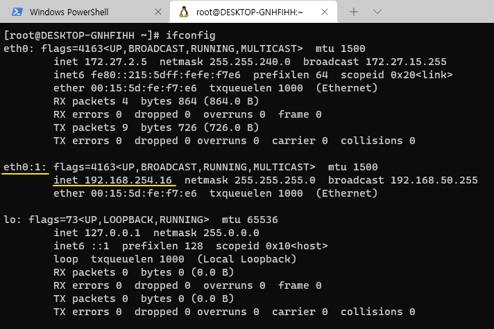 wsl -d (머신 이름) -u root ip addr add 192.168.254.16/24 broadcast 192.168.50.255 dev eth0 label eth0:1