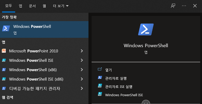 마우스 오른쪽 클릭하여 관리자 권한으로 실행을 눌러도 됩니다.