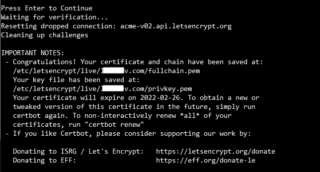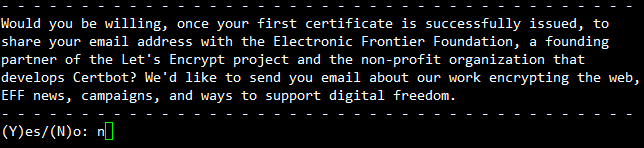 - Certbot을 개발하는 비영리 단체에서 이메일을 보내도 되냐고 물어봅니다. n 입력 후 엔터