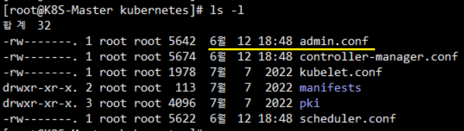 /etc/kubernetes 폴더에서 ll (또는 ls -l) 명령어로 확인하면 admin.conf 파일이 수정된 것이 보인다.