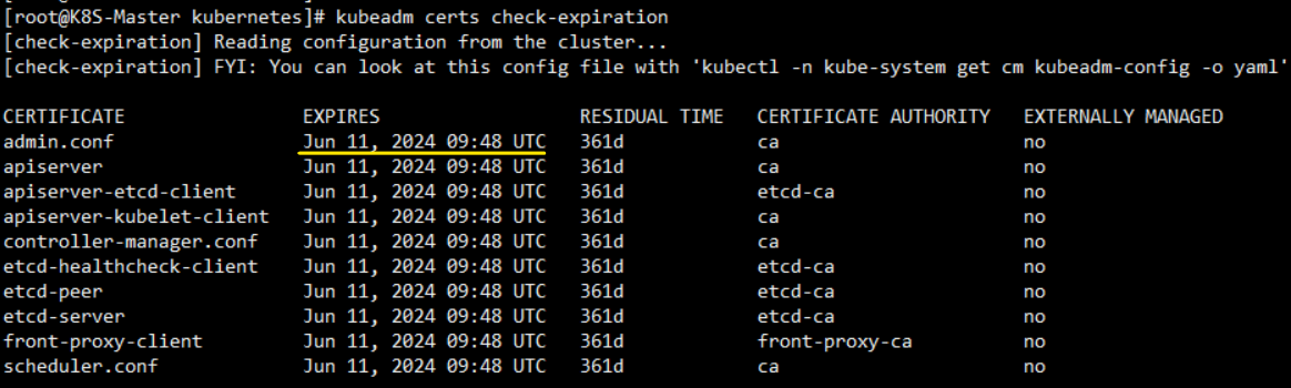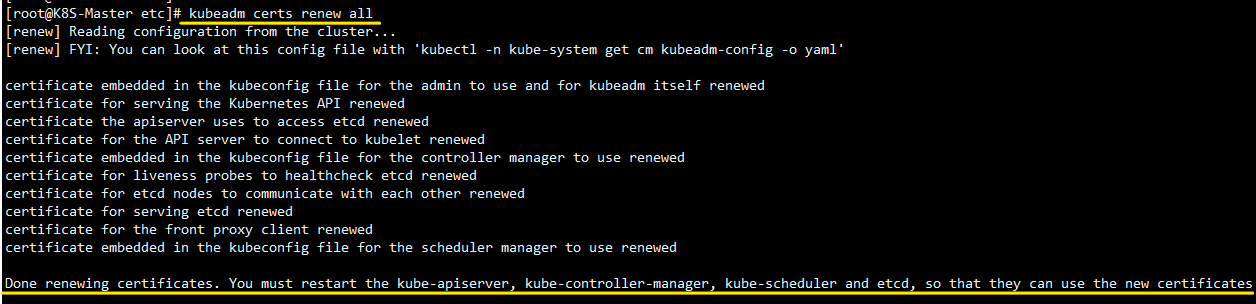 - 맨 아랫줄에 인증서가 갱신되었으니, 변경된 인증서 적용을 위해 kube-apiserver, kube-controller-manager, kube-scheduler, etcd 서비스를 반드시 재기동 하라한다.